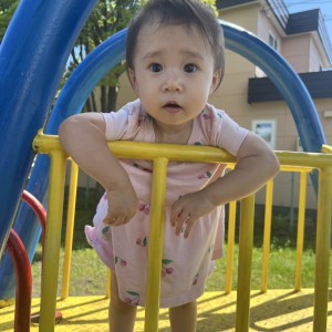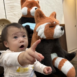♡おもちゃを両手でもち音を鳴らしたり、ぬいぐるみといっしょにお話しする事にハマっていて、最近は歩く練習を頑張っています